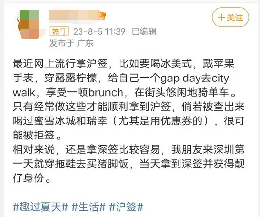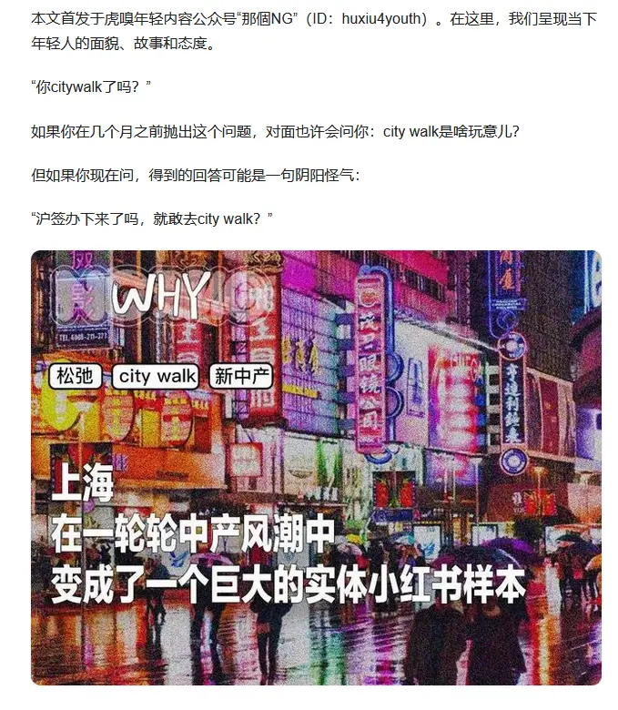 一些媒体则借网络上对city walk与“沪签”等现象进一步讨论起小红书等平台对新中产们的消费主义文化的迎合与极端强化等。