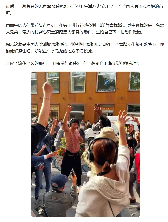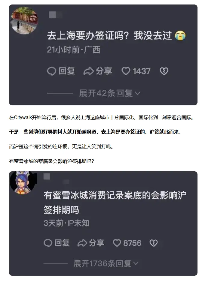 最近一段时间,互联网上流行起“沪籍”与“沪签”之类的梗,直接起因是网友们对前段时间在上海等城市兴起的city walk风潮的调侃,又融合了网民们对过往以上海为代表的国际化城市中盛行的种种消费主义标签,如对咖啡文化的过度迷恋,绅装骑行等等的抵触情绪。