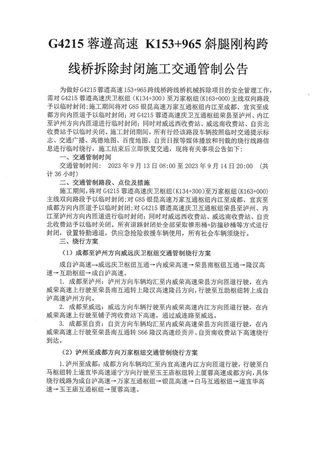 一 交通管制时间 交通管制时间: 2023年9月13日08:00至2023年9月14日20:00 (共计36小时) 二 交通管制路段、点位及措施 施工期间,将对G4215蓉遵高速庆卫枢纽(K134+300)至万家枢纽(K163+000)主线双向路段予以临时封闭;对G85银昆高速万家互通枢纽内江至成都、宜宾至成都方向内匝道予以临时封闭;对G4215蓉遵高速庆卫互通枢纽荣县至泸州、内江至泸州方向内匝道进行临时封闭;同时对威远西收费站、威远南收费站、自贡北收费站予以临时关闭。所有道路封闭处全部采取锥形桶+防撞砂桶等方式进行封闭,设置特勤通道,供应急抢险救援车辆使用,所有社会车辆须绕行。 三 绕行方案 (1)成都至泸州方向威远庆卫枢纽交通管制绕行方案 成自泸高速→威远庆卫枢纽互通→内威荣高速→荣县南枢纽互通→隆汉高速→互助枢纽→成自泸高速。 1. 成都至泸州:泸州方向车辆均汇至内威荣高速荣县方向匝道行驶,在内威荣高速上行驶至荣县南互通转上隆汉高速隆昌方向,行驶至互助枢纽转上成自泸高速泸州方向。 2. 成都至威远:威远方向车辆行驶至内威荣高速内江方向匝道行驶,在内威荣高速上行驶至铺子湾收费站下高速,通过威连路至威远。 3. 成都至自贡:自贡方向车辆均汇至内威荣高速荣县方向匝道行驶,在内威荣高速上行驶至荣县南互通转S66隆汉高速经贡井、自贡南收费站下高速绕行到达。 (2)泸州至成都方向万家枢纽交通管制绕行方案 1.泸州至成都:成都方向车辆均汇至内宜高速内江方向匝道行驶,行驶至白马枢纽转上遂宜毕高速遂宁方向行驶至玉王庙枢纽转上厦蓉高速成都方向,具体绕行线路为成自泸高速→万家互通枢纽→银昆高速→白马互通枢纽→遂宜毕高速→玉王庙互通枢纽→厦蓉高速。 2.威远至成都:由内威荣高速铺子湾收费站上荣县方向匝道行驶,行驶至威远庆卫互通转上成自泸高速成都方向。 (3)G85银昆高速公路万家互通枢纽宜宾至成都、内江至成都交通管制绕行方案 1.宜宾至成都匝道口:由自贡、大山铺、自贡汇东收费站上高速的车辆,行至万家互通枢纽往成都方向匝道口时,继续往内江方向行驶至G76厦蓉高速绕行至成都。 2.内江至成都匝道口:所有由G85银昆高速由内江往宜宾方向经万家互通枢纽往成都方向行驶的车辆,提前经G76厦蓉高速公路、S56内威荣高速绕行前往,已经进入G85银昆高速行至万家互通枢纽往成都方向匝道口的车辆,须前行至大山铺收费站、自贡汇东收费站出站绕行,或前行至S66隆汉高速公路绕行到达。 四 注意事项 请过往车辆严格按照相关收费站入口处公告牌的提示内容以及施工现场交通提示标志行驶,服从交通指挥人员的管理和指挥,对违反公告的行为,高速交警将按照有关法律、法规予以处理。如遇恶劣天气等不可抗力的特殊情况工期顺延,因施工给过往车辆带来的诸多不便,请广大驾乘人员谅解。 值班电话:15388298312(24小时) 特此公告