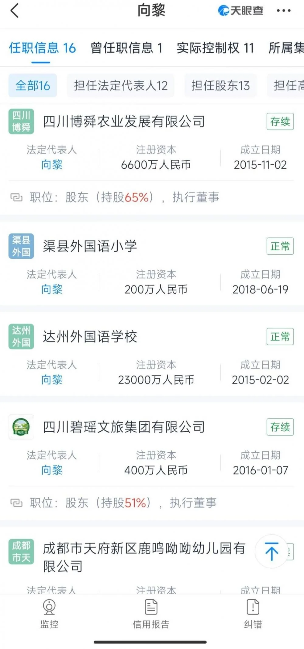 公开报道称,向黎曾任达州外国语学校董事长、校长。企查查APP显示,截至今天(9月15日),达州外国语学校的法定代表人仍是向黎,该校注册资本为2.3亿元,性质为民办非企业单位,曾用名“渠县东方外国语学校”,是一所全封闭、寄宿制学校。