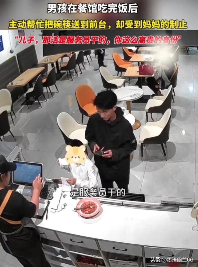 事情本没错,服务员干的工作就是把顾客的餐盘收拾了这无可厚非。但这位母亲说话也实在是不妥。口口声声说儿子这高贵的身份,实在让人不知道她的儿子究竟是什么高贵的身份?是什么王子啊还是皇子呢?人人的身份都是平等的,谁又比谁高贵到哪去呢?