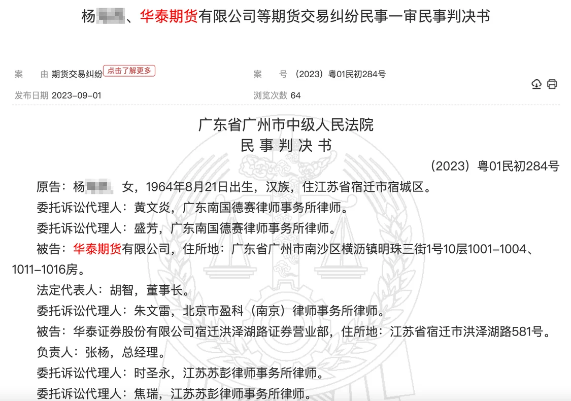 因投诉未能获得满意的结果,杨某燕以未履行适当性管理义务为由,将华泰期货和华泰证券洪泽湖路营业部诉至广州中院。