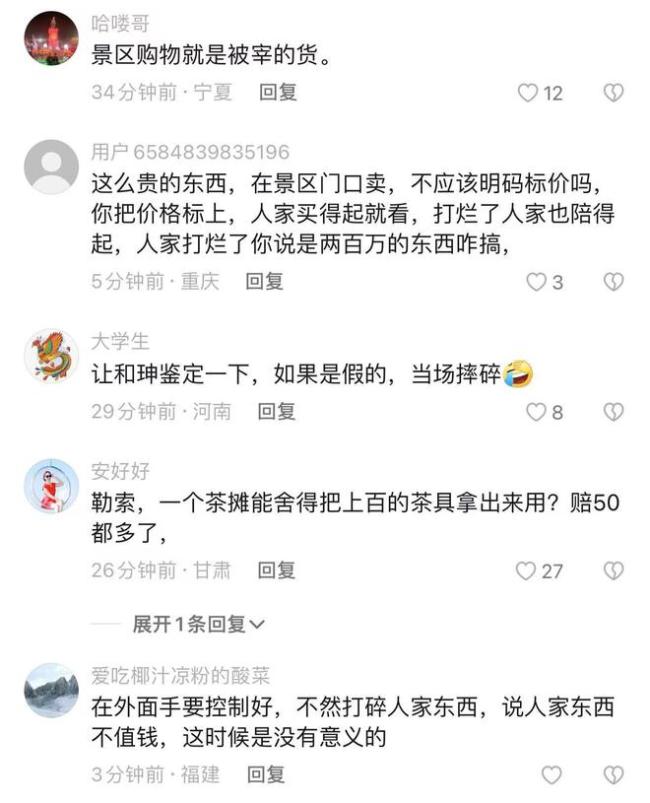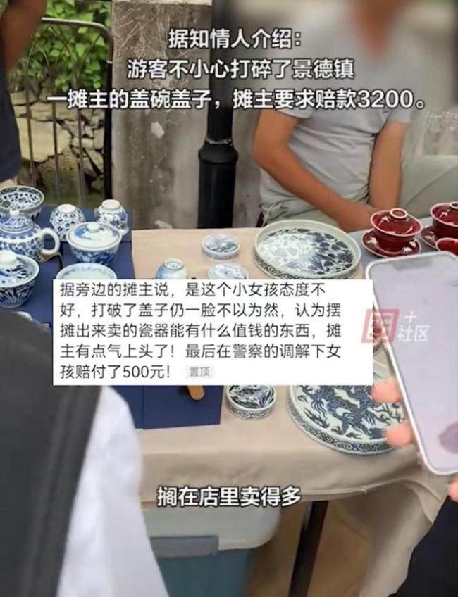游客打破景德镇一摊主的盖碗盖子,竟被索赔3200元 这个在一些景区,有很多人会去摆摊卖一些古玩瓷器,而且一个个开价高的要死。很多人可能都跟我一样好奇,他们卖的那些东西真的值那个价吗?不过我们普通人遇到那些摊子还是要离得远一点,这要是一不小心把人家东西给打碎了,那怕是要赔死你了。 这不9月23日,江西景德镇有一个游客,去景区逛的时候看到有人摆摊卖那些瓷器。她好奇就拿起了其中一个瓷碗,但一不注意,盖碗的盖子掉了下来摔碎了。但这个时候,摊主就拉着她不让他走了,非说这个瓷器非常名贵,要她赔偿3200元才行。 但游客却认为,你这摆摊出来卖的瓷器能有什么值钱的东西,所以就不肯赔那么多。后面双方争执不下,也是报了警。面对警察,摊主还表示这个瓷碗还有更贵的,4-5千的都有。反正说什么,都得让这个女孩赔钱才行。 后面经过警方的调解,这个女孩最终给老板赔偿了五百块钱。至于那个瓷碗到底值不值那么多钱,这个就不清楚了。 所以这件事也告诉了我们,遇到那些摆摊卖瓷器,玉镯那些易碎品的,尽量还是离远一点的好。当然,也不要用手去触碰,不然打坏了的话,那就不好说了。