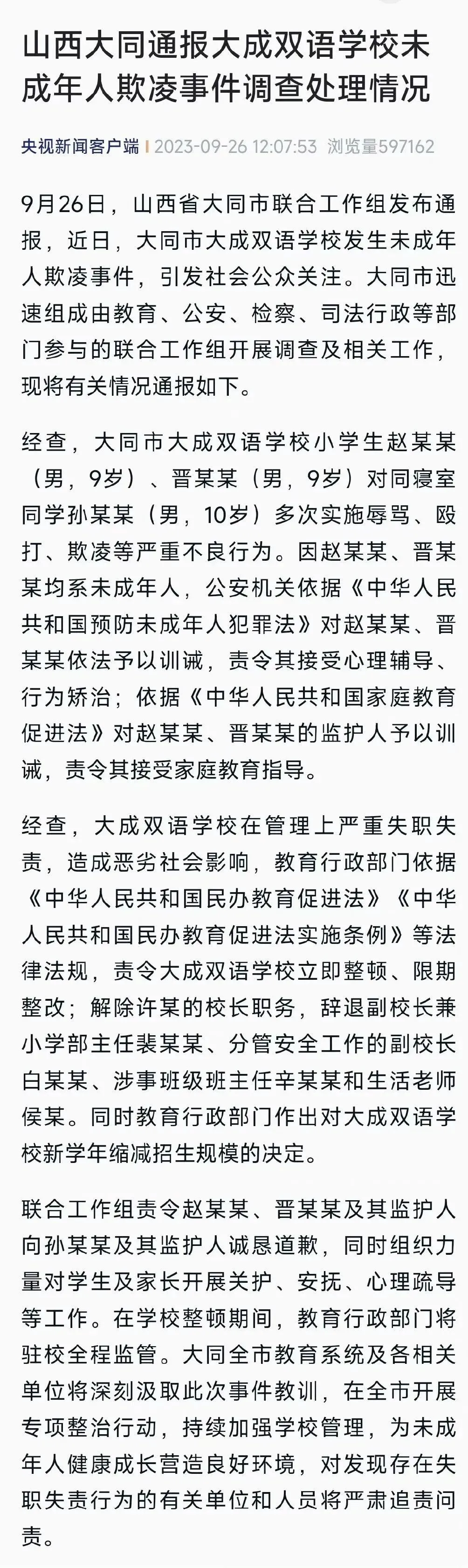 说到底,校园欺凌频发,制度失灵的背后,是学校失职,是管理失范。大同这起事件再次警示各家长、各学校,该承担的责任绝不能推卸,该做的防范一点都不能少。