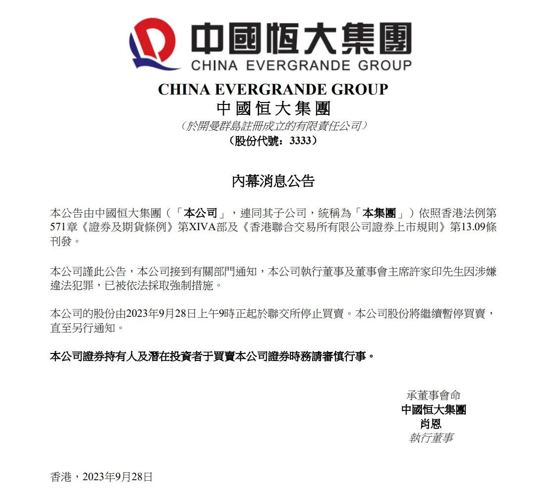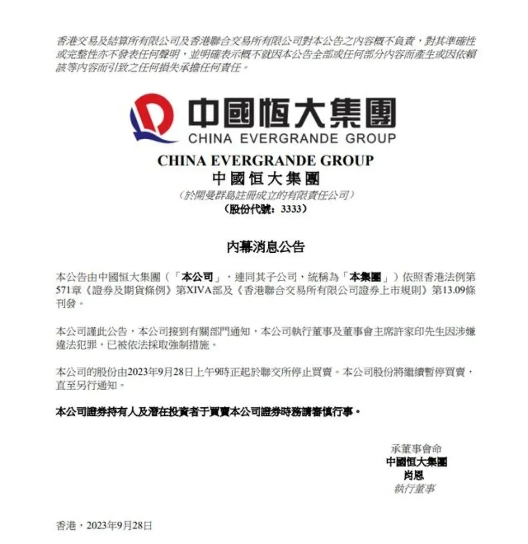9月28日,中国恒大在港交所发布内幕消息公告称,“本公司接到有关部门通知,本公司执行董事及董事会主席许家印因涉嫌违法犯罪,已被依法采取强制措施。本公司的股份由2023年9月28日上午9时正起于联交所停止买卖。本公司股份将继续停止买卖直至另行通知。”