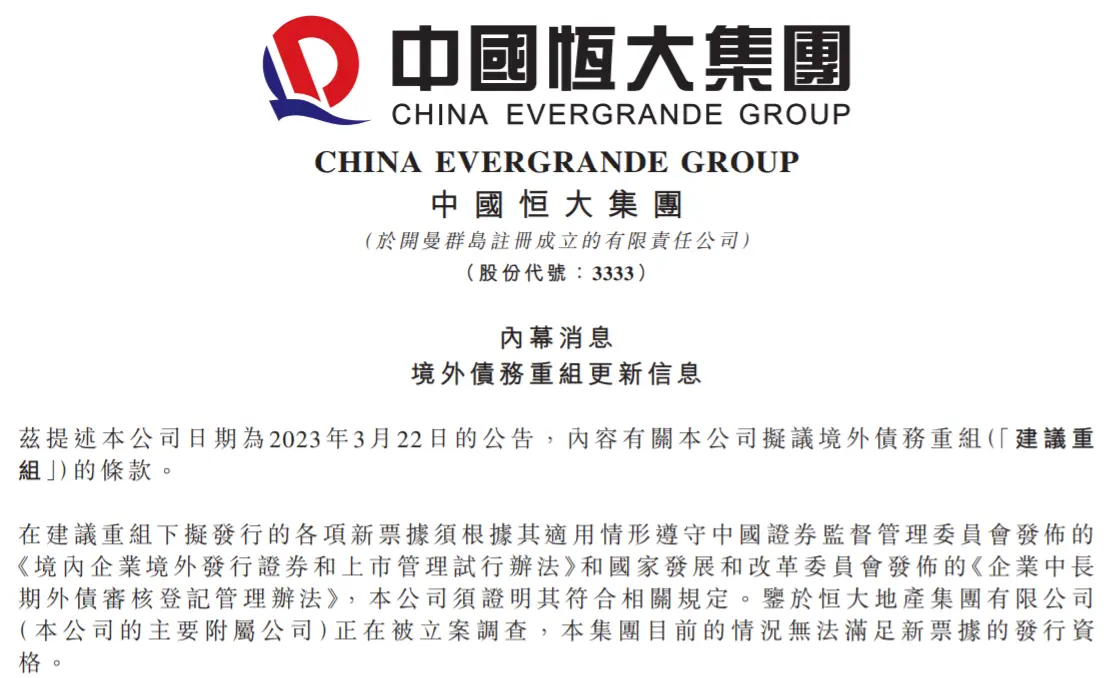 9月24日,恒大发布境外债务重组内幕公告显示,在建议重组下拟发行的各项新票据须根据其适用情形遵守中国证监会发布的《境内企业境外发行证券和上市管理试行办法》和国家发展和改革委员会发布的《企业中长期外债审核登记管理办法》,公司须证明其符合相关规定。鉴于恒大地产集团有限公司(公司的主要附属公司)正在被立案调查,集团目前的情况无法满足新票据的发行资格。