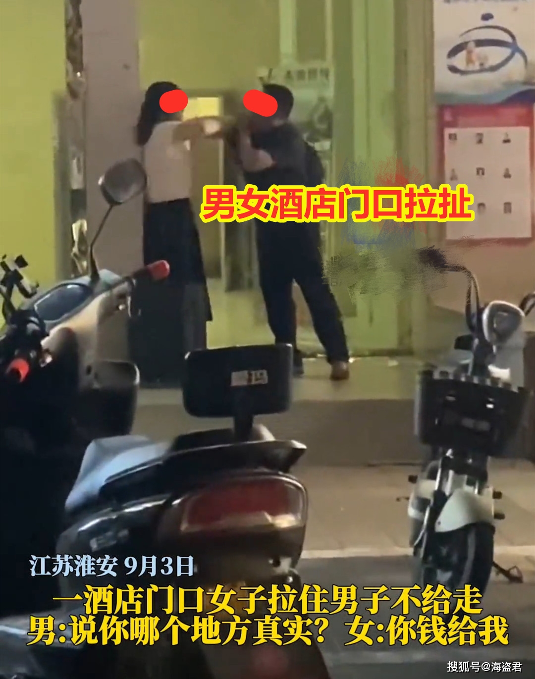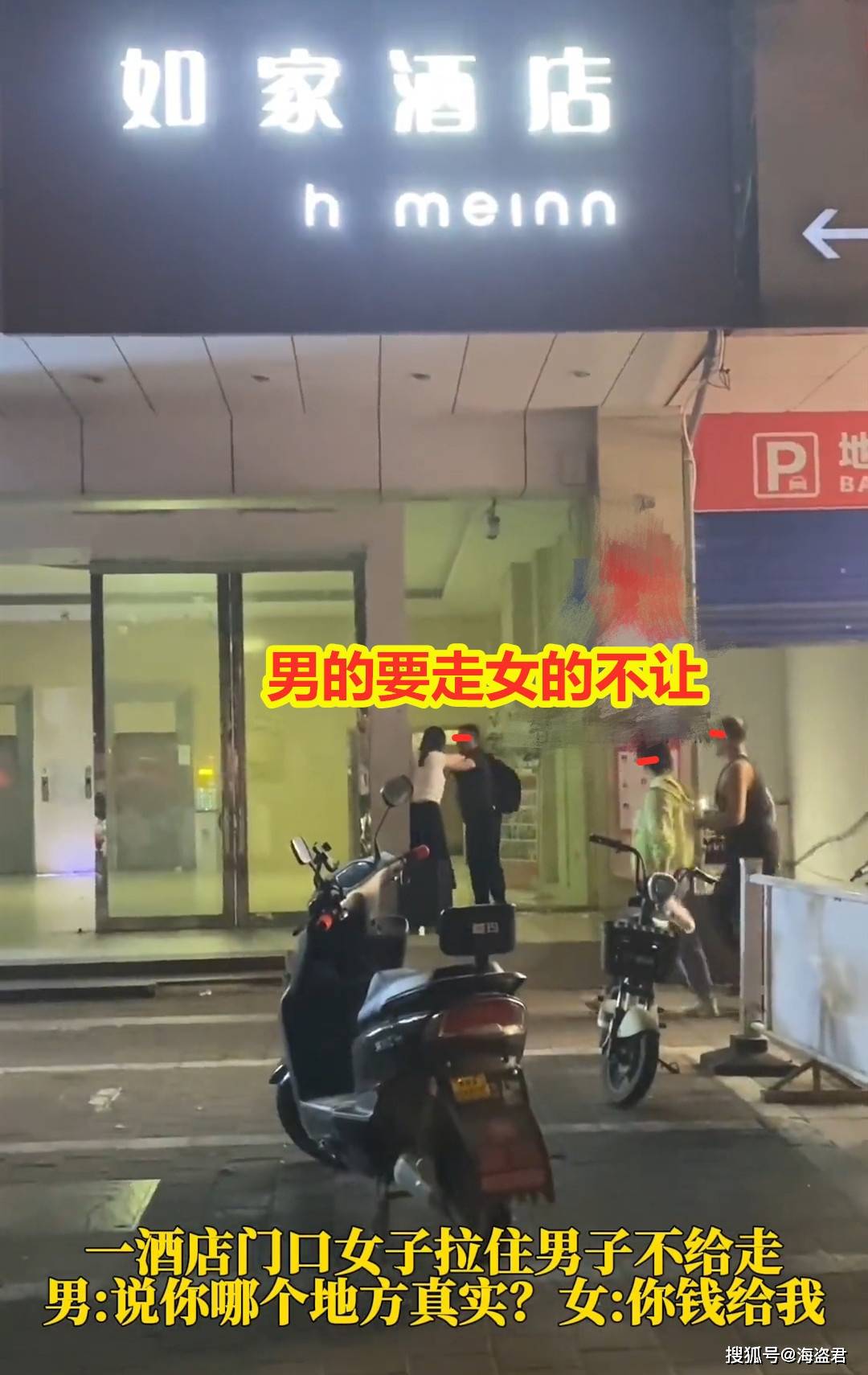 江苏淮安,一名女子在酒店门口拉住男子不给走,男子拼命挣脱,一点都不怜香惜玉。