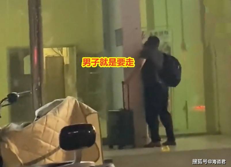 男子背着包推着行李箱走到酒店门口,女子跟过来抓住他不让他走。