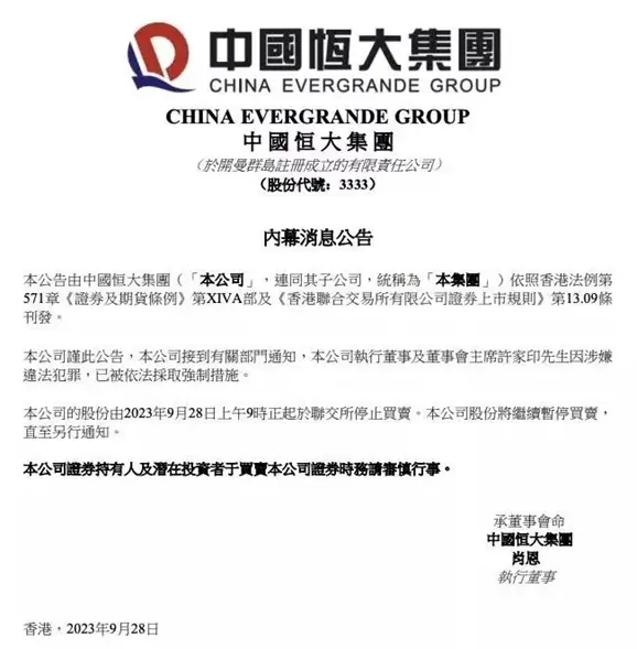 9月28日晚,中国恒大(3333.HK)发布上市公司公告,称公司董事局主席许家印因涉嫌违法犯罪,已被依法采取强制措施。