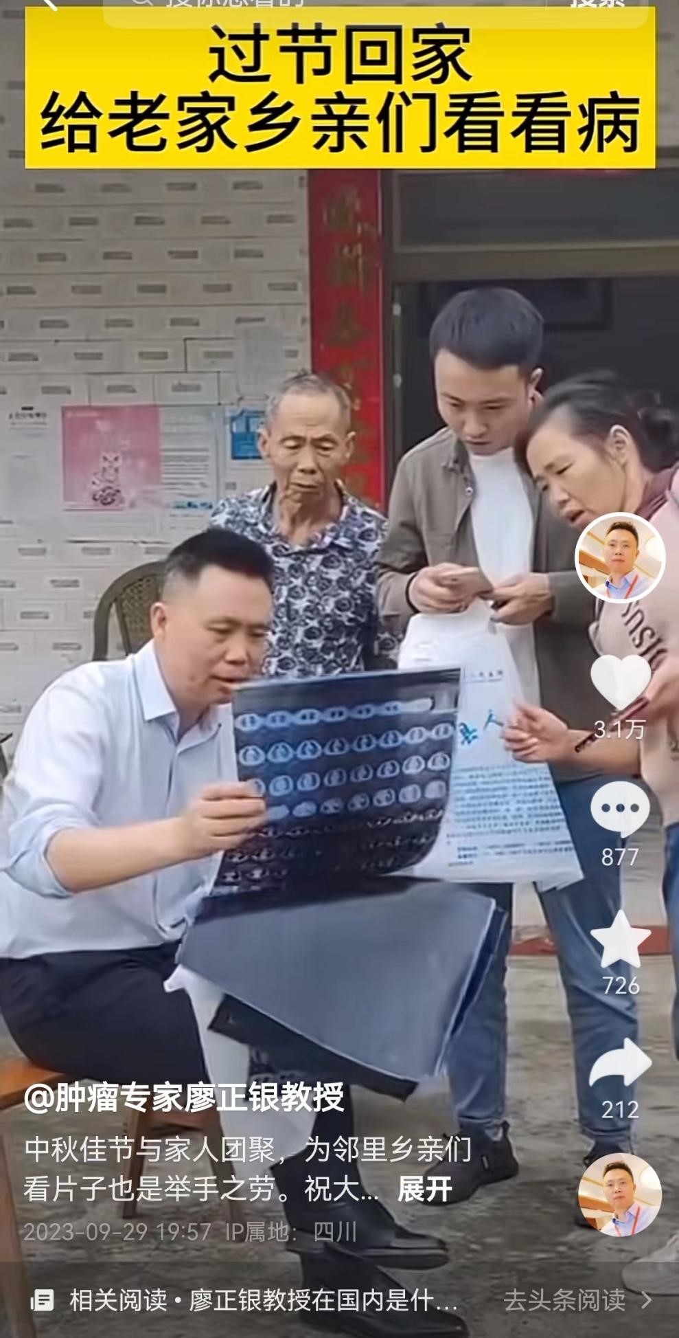 9月30日,中秋国庆双节期间,四川大学华西医院肿瘤中心主任医师廖正银回到四川自贡老家,在抖音平台@肿瘤专家廖正银发布看诊视频,记录自己过节回家为乡邻看病情景。