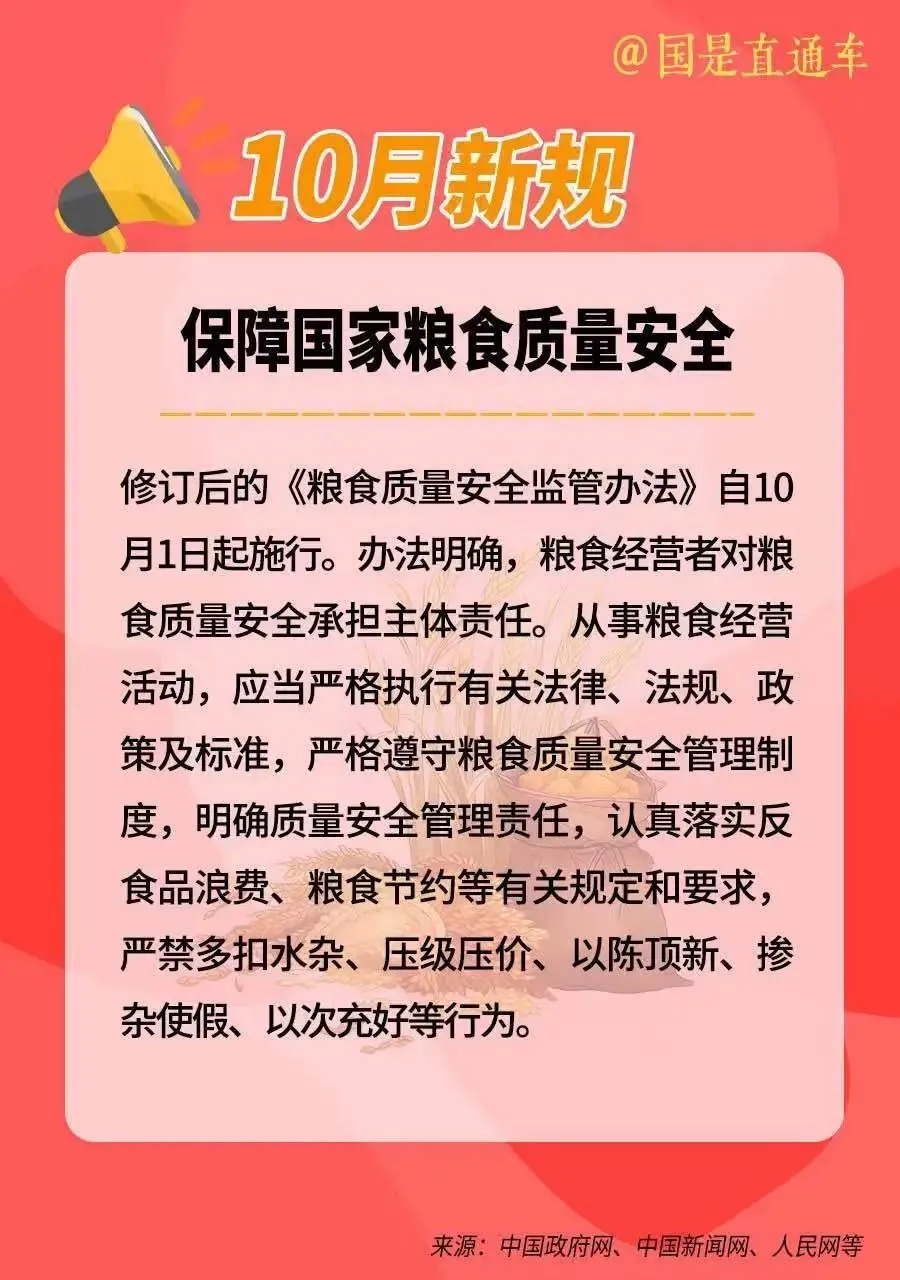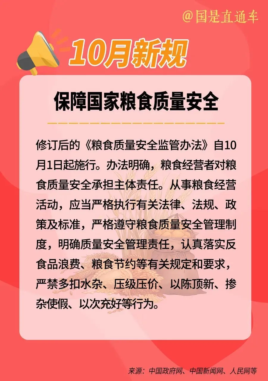进入10月,一批新规将陆续施行。加强校外培训监管、加强婴幼儿配方乳粉产品配方注册管理、治理“假国企”蹭名乱象、依托咪酯列入第二类精神药品目录……涉及教育、医疗、食品安全、道路交通等多方面。和国是君一起来看看吧。 保障国家粮食质量安全 严禁压级压价
