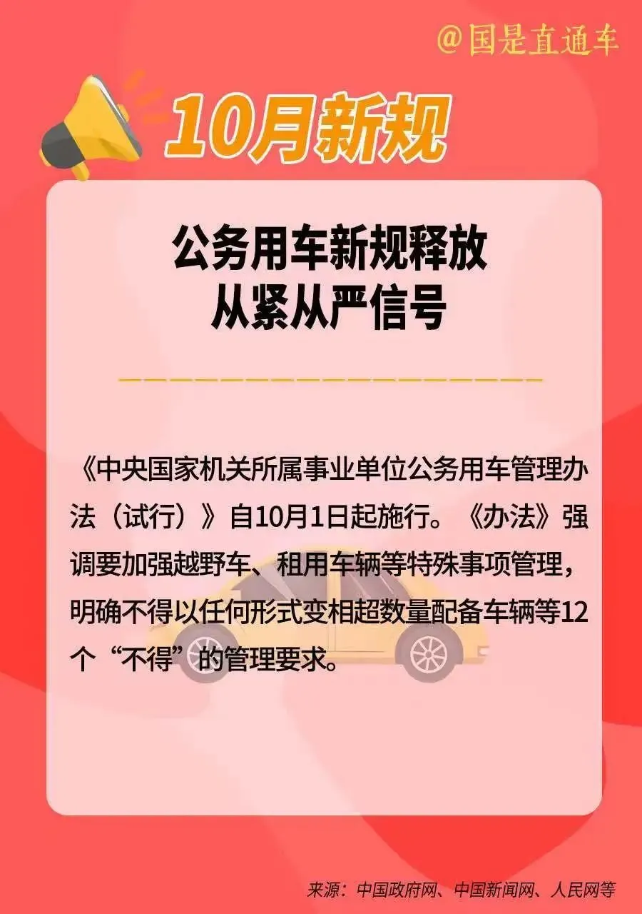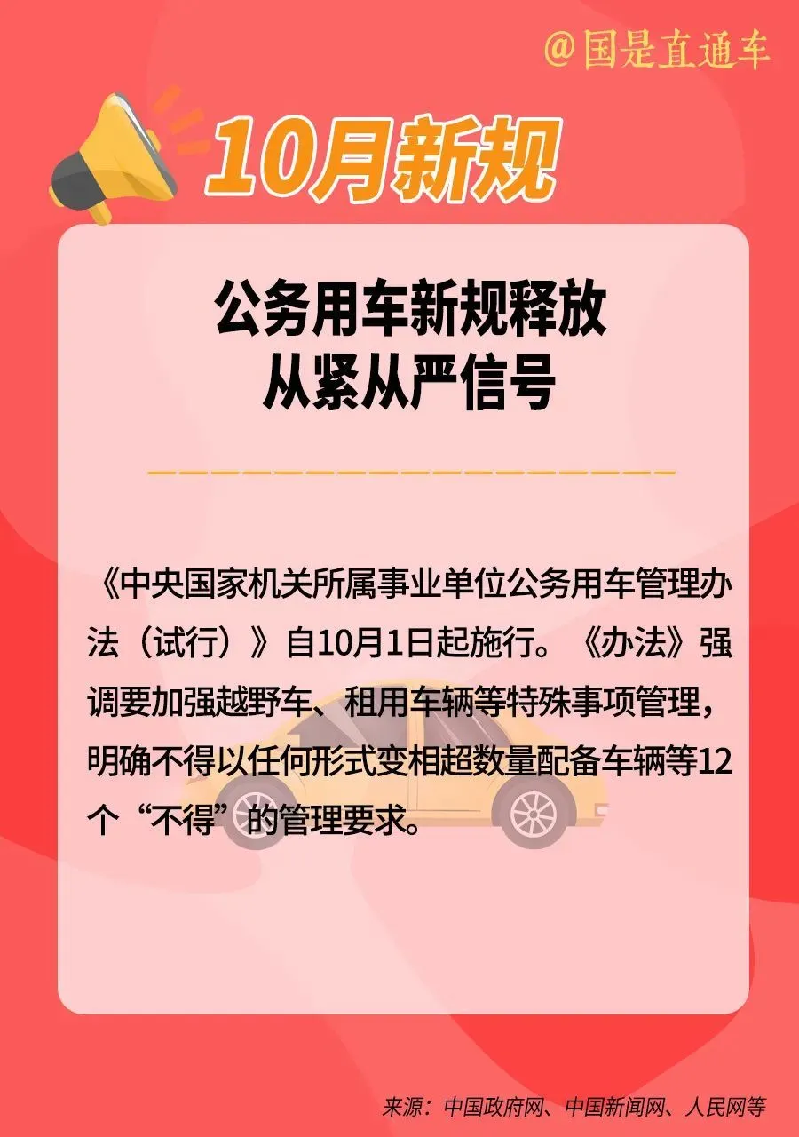 国家机关事务管理局印发《中央国家机关所属事业单位公务用车管理办法(试行)》自10月1日起施行。 办法明确了事业单位公务用车管理遵循总额控制、经济适用、节能环保、规范高效的原则,公务出行应当坚持社会化、市场化方向,强调要将坚持勤俭办一切事业的要求贯彻落实到公务用车管理的全流程、各环节,节约高效保障公共服务和公益事业需要。 其中,《办法》强调要加强越野车、租用车辆等特殊事项管理,明确不得以任何形式变相超数量配备车辆等12个“不得”的管理要求。 预防和制止假冒 国企央企等违法行为