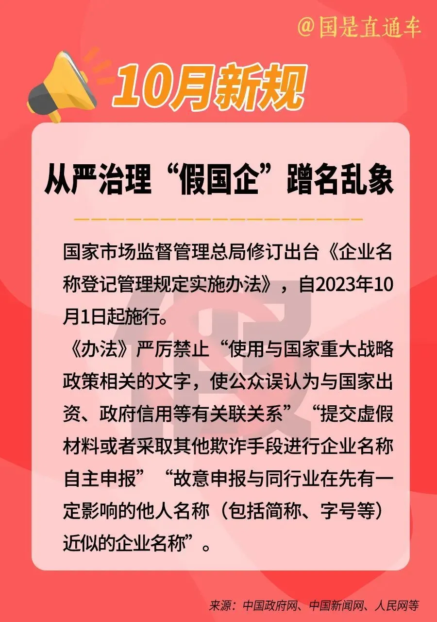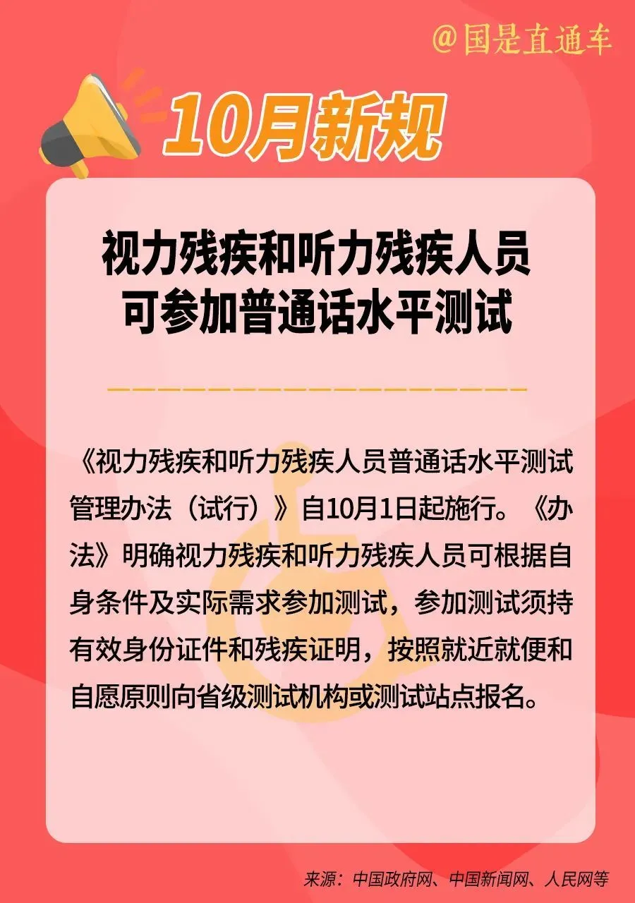 国家市场监管总局修订后的《企业名称登记管理规定实施办法》自10月1日起施行。 其中,在规范企业名称登记管理秩序方面,《办法》明确,为预防和制止假冒国企央企等违法行为,严厉禁止“使用与国家重大战略政策相关的文字,使公众误认为与国家出资、政府信用等有关联关系”“提交虚假材料或者采取其他欺诈手段进行企业名称自主申报”“故意申报与同行业在先有一定影响的他人名称(包括简称、字号等)近似的企业名称”。 视力残疾和听力残疾人员 可参加普通话水平测试