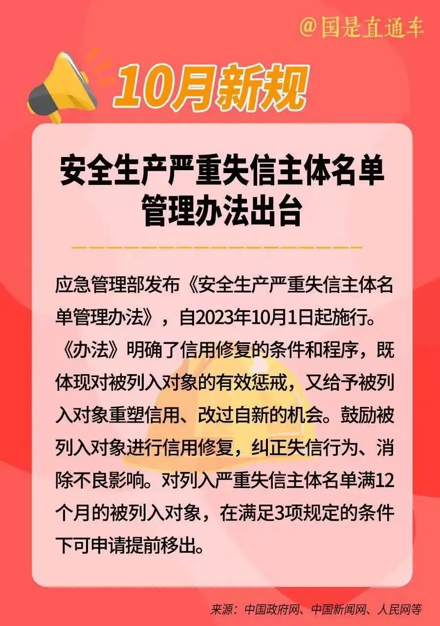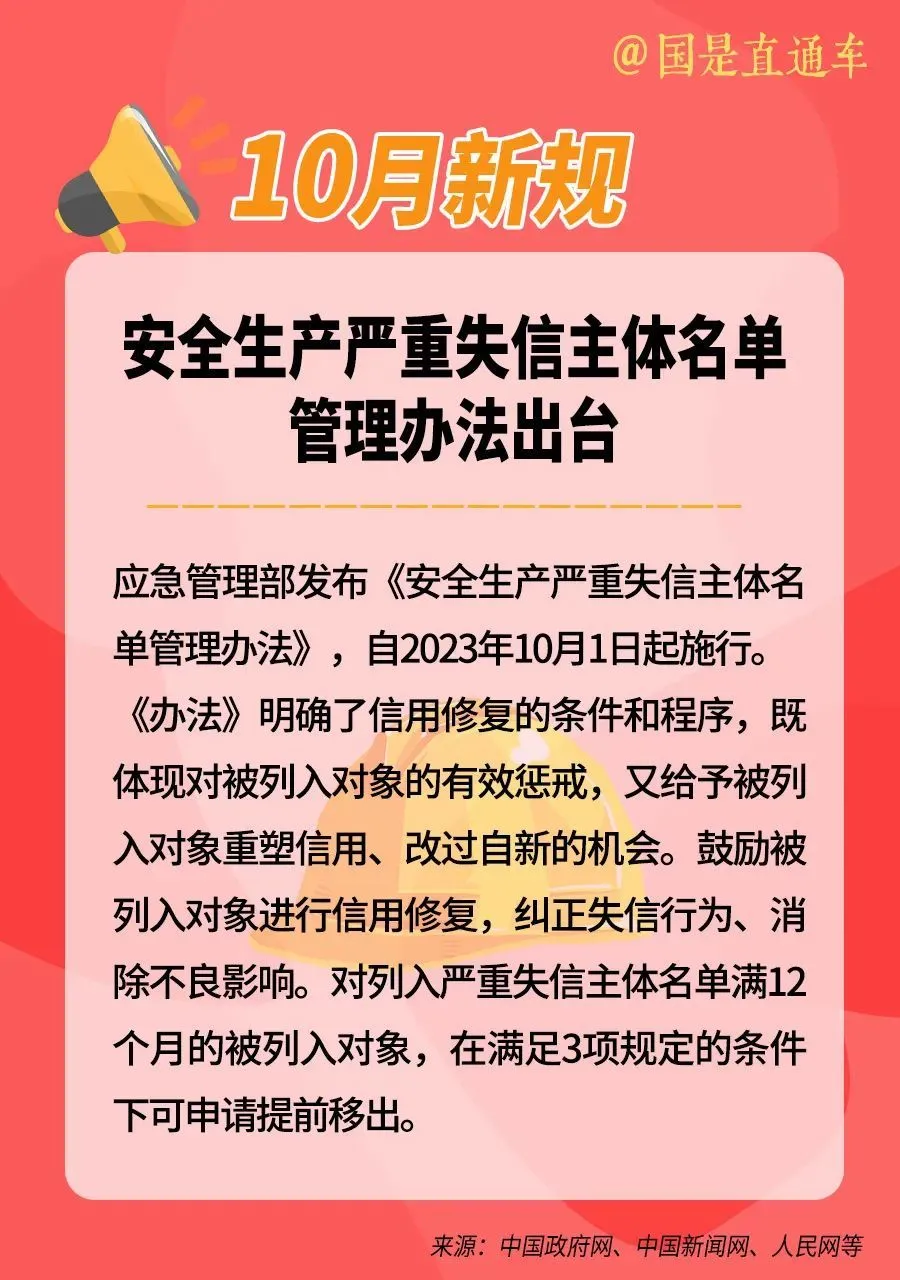 交通运输部办公厅发布《道路运输企业和城市客运企业安全生产重大事故隐患判定标准(试行)》自2023年10月1日起施行。 《标准》规定,道路普通货物运输、危险货物道路运输存在“长期‘三超一疲劳’”“故意夹带危险货物或违规运输禁运、限运物品”“违法装载导致车货总质量超过100吨”“运输危险货物过程中包装容器损坏、泄漏”“所属危险货物运输车辆未按规定采取相关安全防护措施”等情形时,应当判定为重大事故隐患。 一批地方性法规也将施行 【甘肃颁布地方性法规保护“母亲河”】甘肃省出台的首部配套黄河流域生态保护和高质量发展方面的基础性、综合性地方性法规《甘肃省黄河流域生态保护和高质量发展条例》,将于2023年10月1日起施行。 《条例》共十章97条,主要聚焦规划与管控、生态保护与修复、水资源节约集约利用与管理、污染防治、促进高质量发展、黄河文化保护传承弘扬、保障与监督和法律责任等方面,填补了甘肃省黄河流域生态保护法规的空白,推动了生态环境保护领域法规要素全覆盖,以良法保障善治。 【广东深圳:职工医保普通门诊报销额度提高】深圳市医保局发布《深圳市医疗保障办法》,自2023年10月1日正式实施。按照规定,居民基本医保参保人普通门诊年度报销额度由原来的每个医保年度固定1000元,提高到本市上上年度在岗职工年平均工资的1.5%,取消单项诊疗项目或医用材料最高报销120元的限制。同时,将少儿学生医保纳入深圳居民基本医保参保范围。 【北京:20张病床需配1名保安员】北京《保安服务规范医院》地方标准将于2023年10月1日开始实施。其中规定,医院同时在岗保安人数应按照“在岗在编医务人员总数的3%”“20张病床1名保安员”“日均门诊量的3‰”三种标准的最高数量配置,并可根据医院实际情况增加保安员数量。 【广西:高速通行费减半优惠】2023年10月7日起至2023年12月31日止,每周五(00:00)时至周日(24:00)时(国庆节假期调休除外),对来广西旅游的外省籍一类客车(即9座(含)以下小(微)型乘用车),并且使用ETC电子支付方式在广西境内高速公路任一收费站驶出的,给予广西境内高速公路通行费减半优惠。减半优惠仅限于在广西高速公路产生的通行费,在区外高速公路产生的通行费不在减半优惠范围之内。