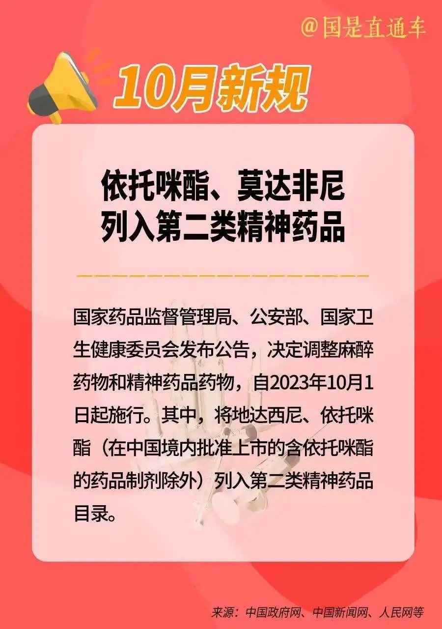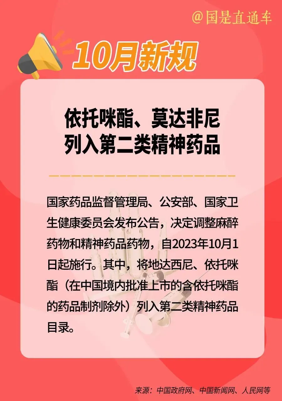 国家市场监督管理总局发布修订后的《婴幼儿配方乳粉产品配方注册管理办法》自10月1日起施行。 《办法》明确,禁止变相分装(使用已经符合婴幼儿配方食品安全国家标准营养成分要求的复合配料作为原料申请配方注册的)和8种不予注册的情形;明确标签、说明书不得含有的9种情形,不得使用“进口奶源”“源自国外牧场”“生态牧场”“进口原料”“原生态奶源”“无污染奶源”等模糊信息;不得使用婴儿和妇女的形象,“人乳化”“母乳化”或者近似术语表述;不得使用其他不符合法律、法规、规章和食品安全国家标准规定的内容。 依托咪酯列入 第二类精神药品目录