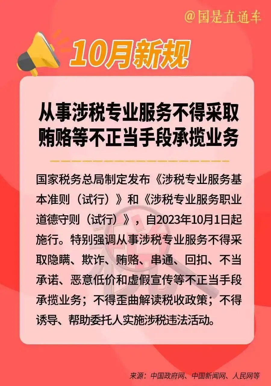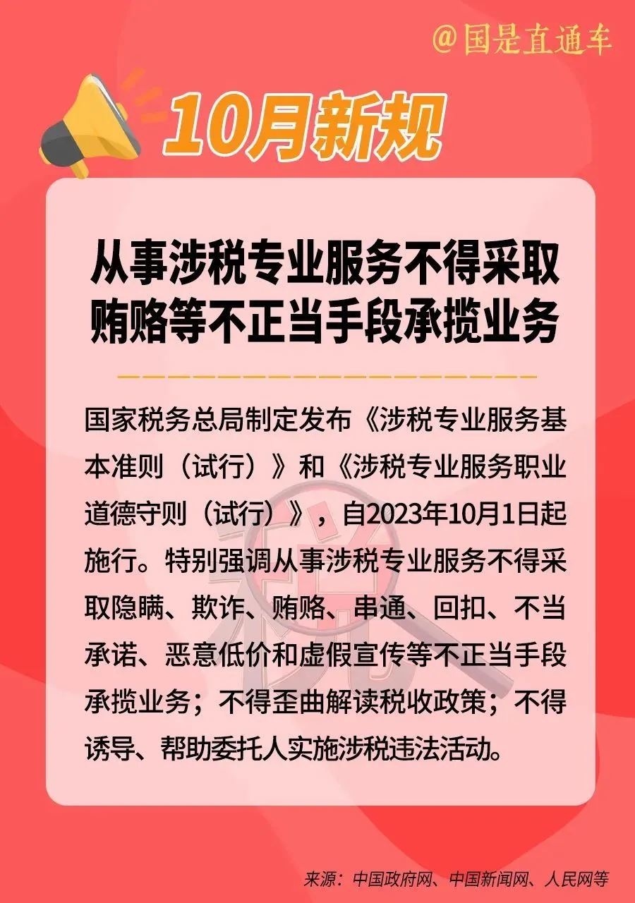 财政部公布《普惠金融发展专项资金管理办法》,自2023年10月1日起施行,实施期限五年。 其中,将创业担保贷款个人贷款额度上限由20万元提高至30万元,小微企业贷款额度上限由300万元提高至400万元,预计每年可新增创业担保贷款1161亿元,带动约100万人创业就业。 优化小微企业新招用人数与企业现有在职职工人数的占比,由15%调整为10%,超过100人的企业由8%调整为5%,适当放宽小微企业贷款申请条件,让更多小微企业享受政策支持。 规范涉税专业服务 明令五个“不得”
