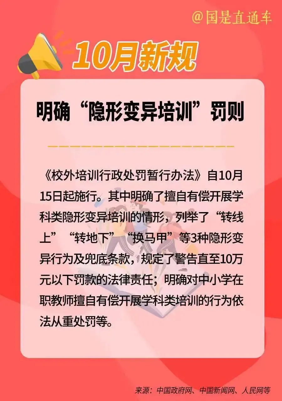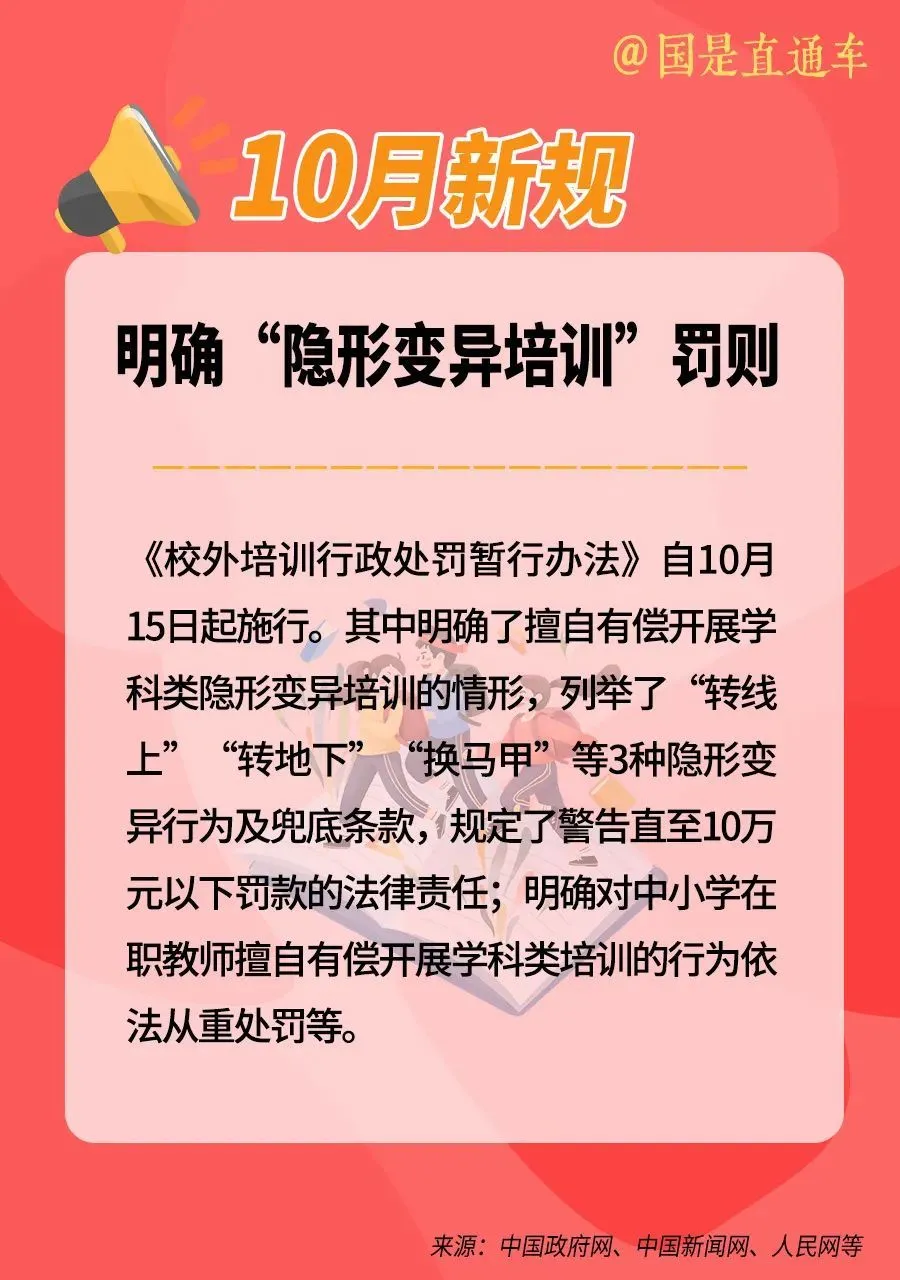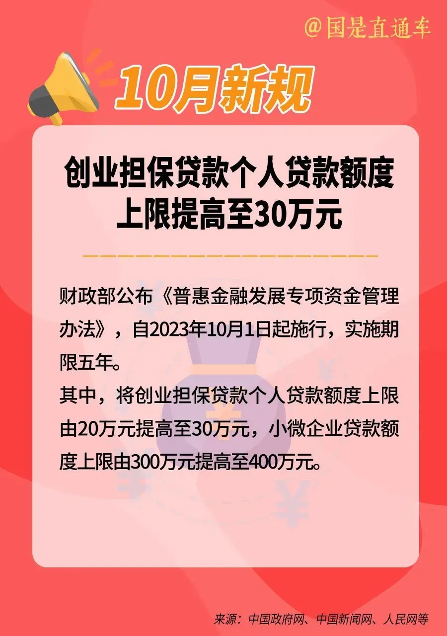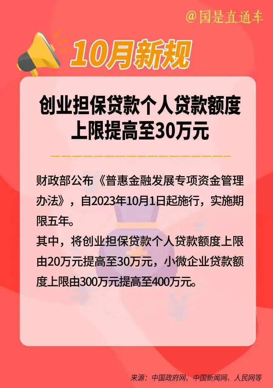 《校外培训行政处罚暂行办法》自10月15日起施行,加强校外培训监管,规范校外培训行政处罚行为。 其中明确,自然人、法人或者其他组织面向社会招收3周岁以上学龄前儿童、中小学生,违法开展校外培训,应当给予行政处罚的,适用本办法;明确了擅自有偿开展学科类隐形变异培训的情形,列举了“转线上”“转地下”“换马甲”等3种隐形变异行为及兜底条款,规定了警告直至10万元以下罚款的法律责任;明确对中小学在职教师擅自有偿开展学科类培训的行为依法从重处罚等。 创业担保贷款个人贷款额度 上限提高至30万元