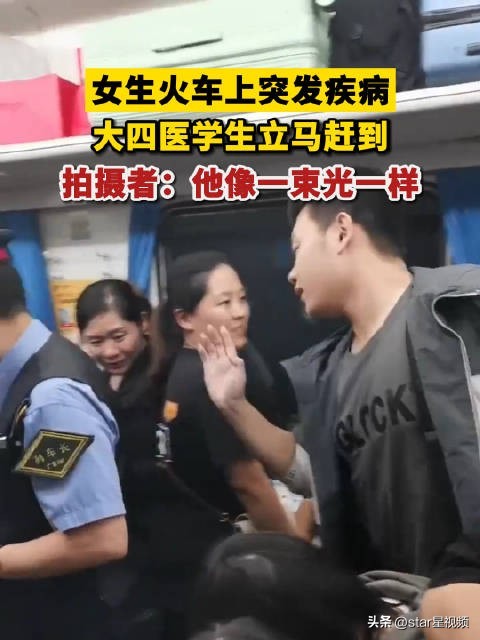 看见这位医学生出现的那一刻非常感动,他从拥挤的车厢赶来就像一束光。
