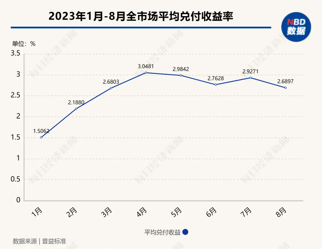 记者从普益标准独家获得的数据显示,今年1-4月理财产品兑付收益呈现逐渐上升的趋势,其中4月平均兑付收益率达全年最高3.0481%;此后收益略有下降,截至8月,全市场平均兑付收益为2.6897%。