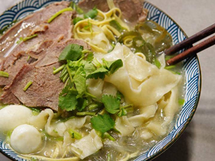 河南烩面是一种宽面、高汤、配菜结合的独特美食。烩面的汤选用上等嫩羊肉和羊骨作为主要食材,经过大火煮沸后,再用小火慢炖五小时以上,熬制出汤色白亮、口感醇厚浓郁的汤汁,就像是牛乳一样醇厚可口。此外,烩面中还加入了海带丝、千张丝、粉条、香菜和鹌鹑蛋等辅料,这些食材不仅增加了烩面的口感层次,还让整道菜品更加美味可口。