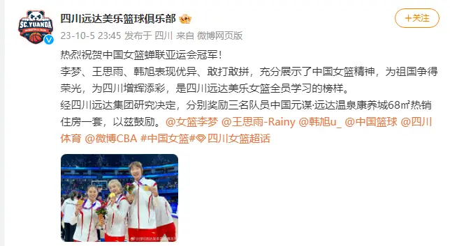 热烈祝贺中国女篮蝉联亚运会冠军! 李梦、王思雨、韩旭表现优异、敢打敢拼,充分展示了中国女篮精神,为祖国争得荣光,为四川增辉添彩,是四川远达美乐女篮全员学习的榜样。 经四川远达集团研究决定,分别奖励三名队员中国元谋·远达温泉康养城68㎡热销住房一套,以兹鼓励。