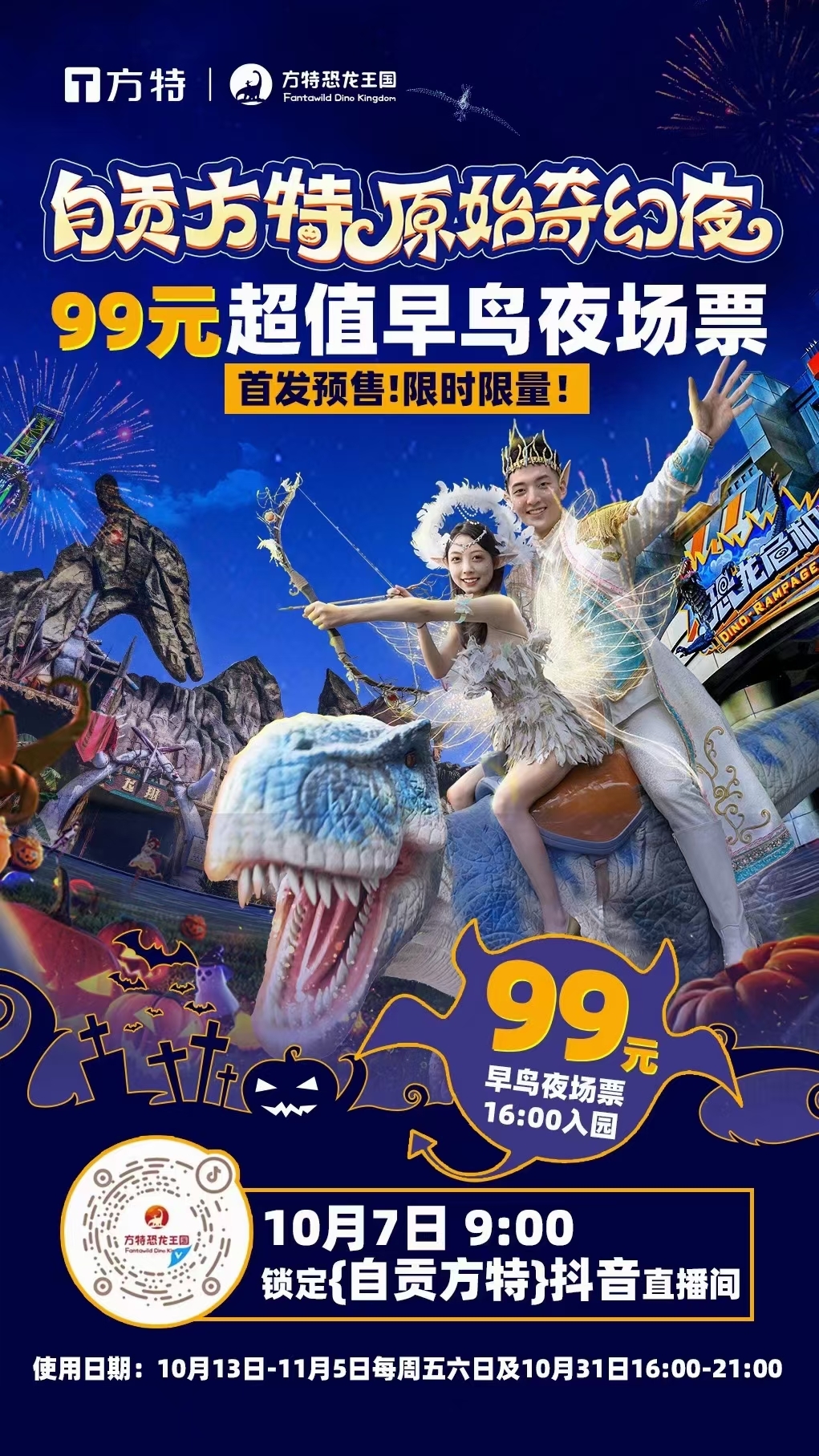 #自贡方特原始奇幻夜 超值预售¥99元超值早鸟夜场票刷项目看演艺玩夜场10月7日9:00锁定「自贡方特」直播间