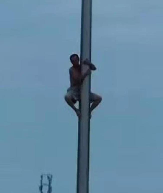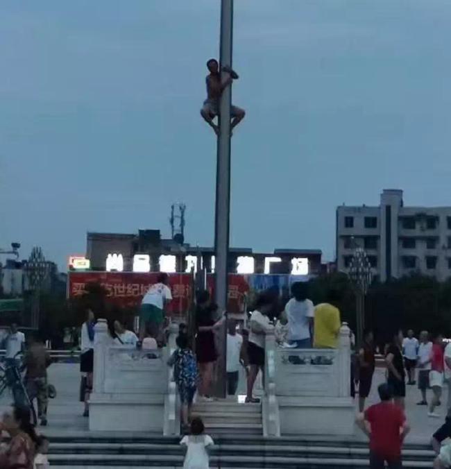 一男子在没有安全绳,没有头盔,光溜溜的旗杆总得有六七米高,徒手就爬上去了。