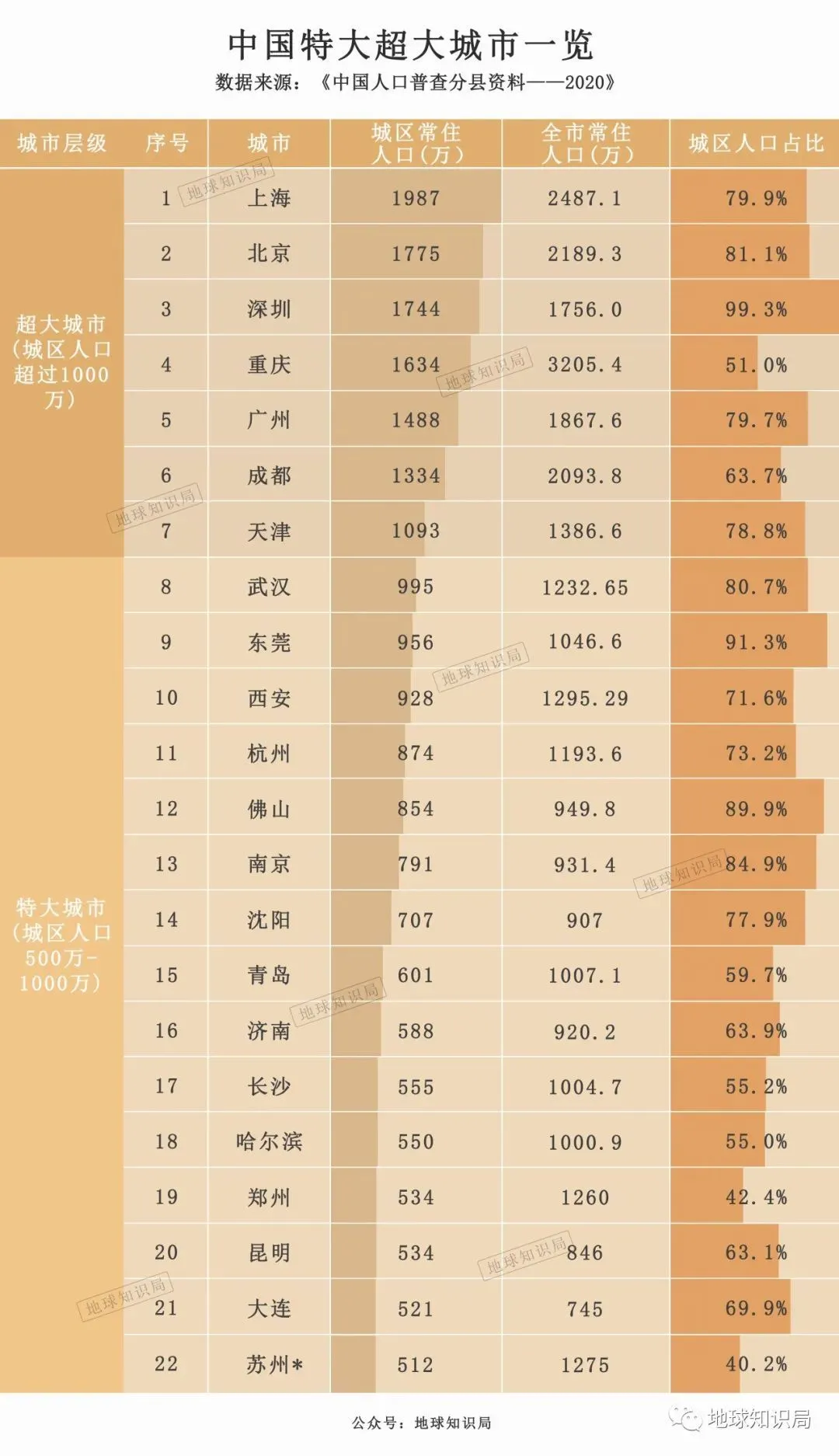 根据《中国人口普查分县资料——2020》,全国有超大城市7个,特大城市15个。