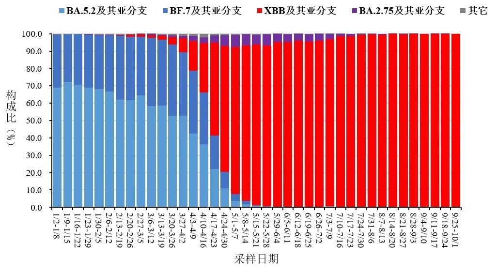 图3-2 全国哨点医院流感样病例新冠和流感病毒阳性率变化趋势 四、本土病例病毒变异监测情况 2023年9月1日-9月30日,全国31个省(自治区、直辖市)及新疆生产建设兵团共报送11629例本土病例新冠病毒基因组有效序列,均为奥密克戎变异株,涵盖96个进化分支,主要流行株为XBB系列变异株,占比前三位的分别为XBB.1.9及其亚分支、XBB.1.22及其亚分支、XBB.1.16及其亚分支。 根据采样日期,XBB及其亚分支的占比持续高位,2023年第35周(8月28日-9月3日)为99.7%,36周至38周保持在99.8%,第39周(9月25日-10月1日)为100.0%。见图4。