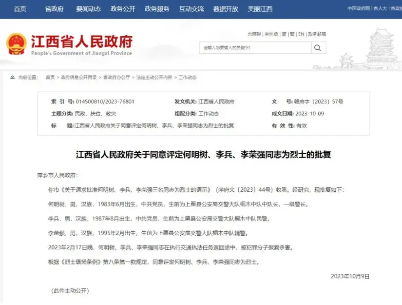 据“江西省人民政府”微信公众号消息,江西省人民政府9日公布关于同意评定何明树、李兵、李荣强同志为烈士的批复。原文如下: