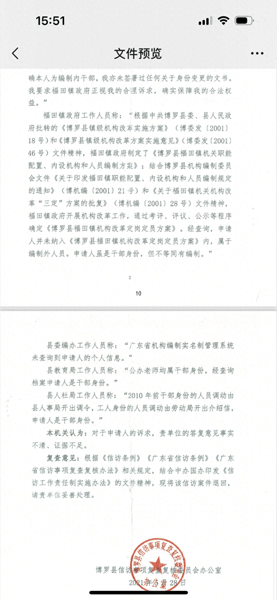 澎湃新闻注意到,博罗县信访事项复查复核委员会办公室于2021年5月作出的《关于曾耀强申请信访复查处理的函》显示,针对曾耀强反映的问题,博罗县教育局工作人员称,办公教师均属于干部身份,经查询档案曾耀强是干部身份;博罗县人社局工作人员称,“2010年前干部身份的人员调动是由县人事局开出调令,工人身份的人员调动是由劳动局开出介绍信,申请人(指曾耀强)是干部身份”。