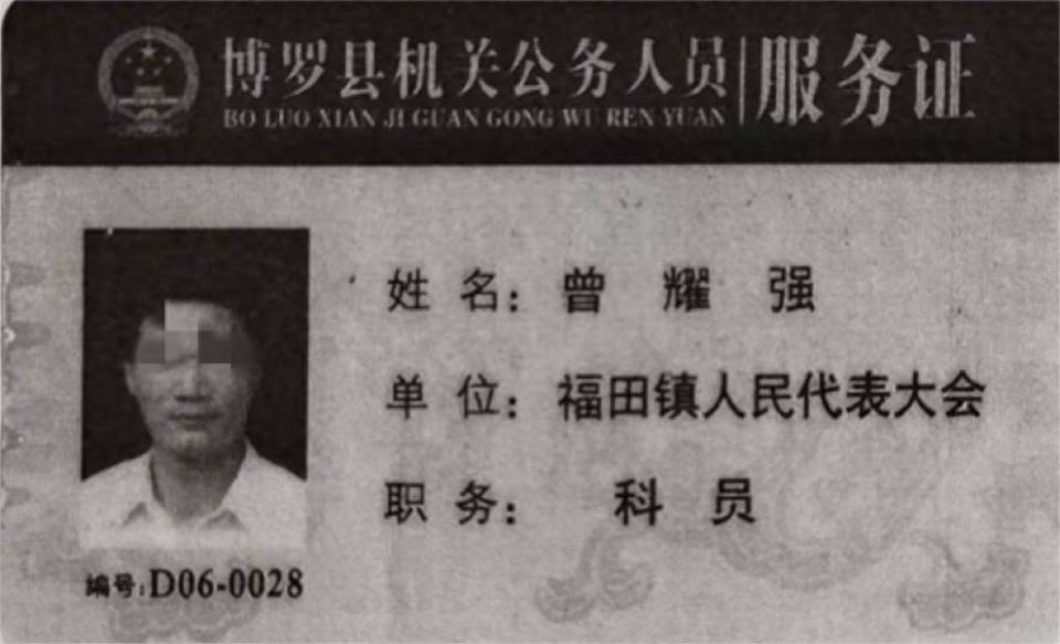 2023年2月,惠州市人民政府作出的一份《行政复议决定书》显示,1991年,曾耀强从公办学校调动到福田镇政府工作,其个人档案有一份《广东省国家公务员过渡审批表》,填写时间为1998年5月,其中载明曾耀强身份为国家干部,过渡职位为福田镇农林水办公室办事员,过渡考核为合格,岗位培训及过渡培训均为60分以上。该审批表经所在单位审查同意、主管部门研究同意后,由原博罗县人事局于1998年6月盖章同意过渡为国家公务员。此外,曾耀强的档案内有多份年度干部考核任免表,最新的考核任免表为2011年度。