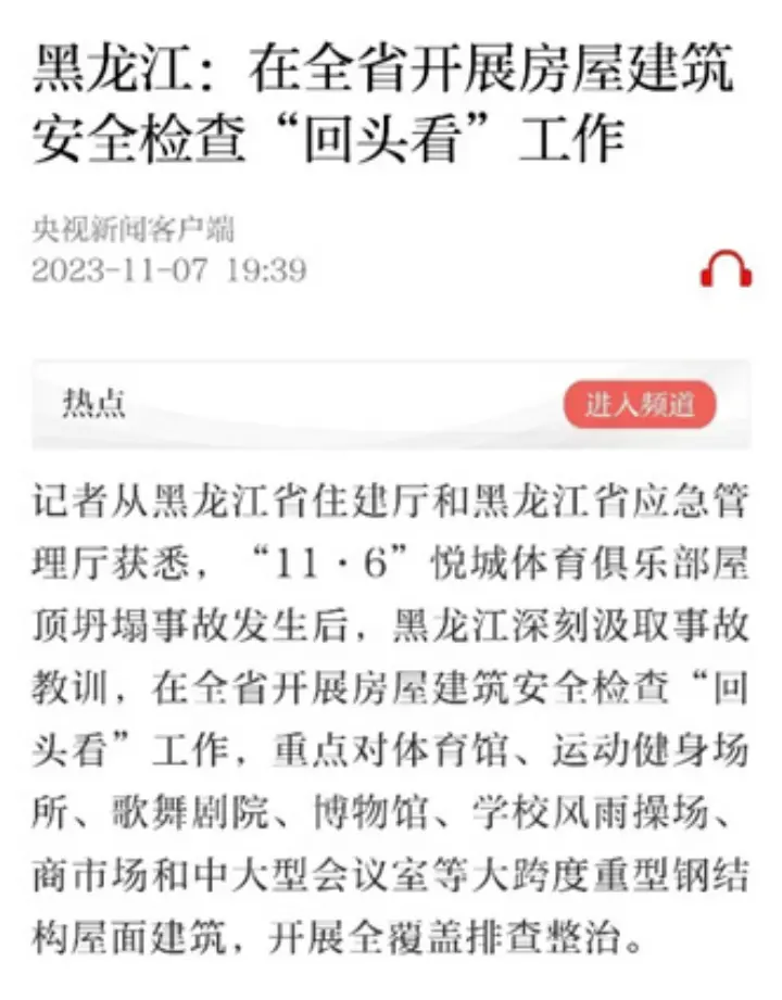 据央视新闻报道,11·6”悦城体育俱乐部屋顶坍塌事故发生后,黑龙江在全省开展房屋安全检查“回头看”工作,重点对体育馆、运动健身场所、歌舞剧院、博物馆、学校操场等大跨度重型钢结构屋面建筑安全隐患开展全覆盖排查整治。