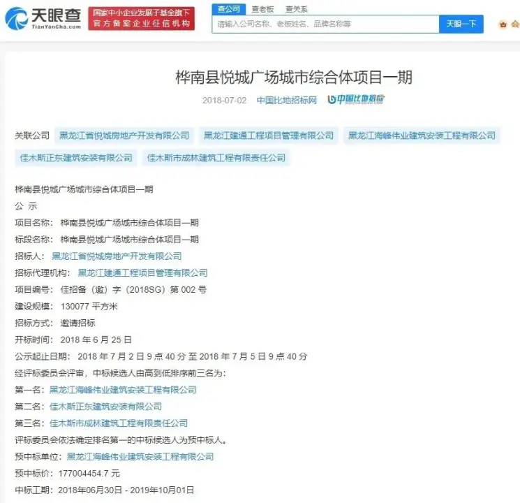据天眼查,作为悦城广场综合体项目的总包单位,黑龙江省悦城房地产开发有限公司已经在2022年5月11日被注销。该公司经营范围包括房地产开发经营、物业管理、室内外装饰、装修,柜台租赁服务,房屋租赁等。