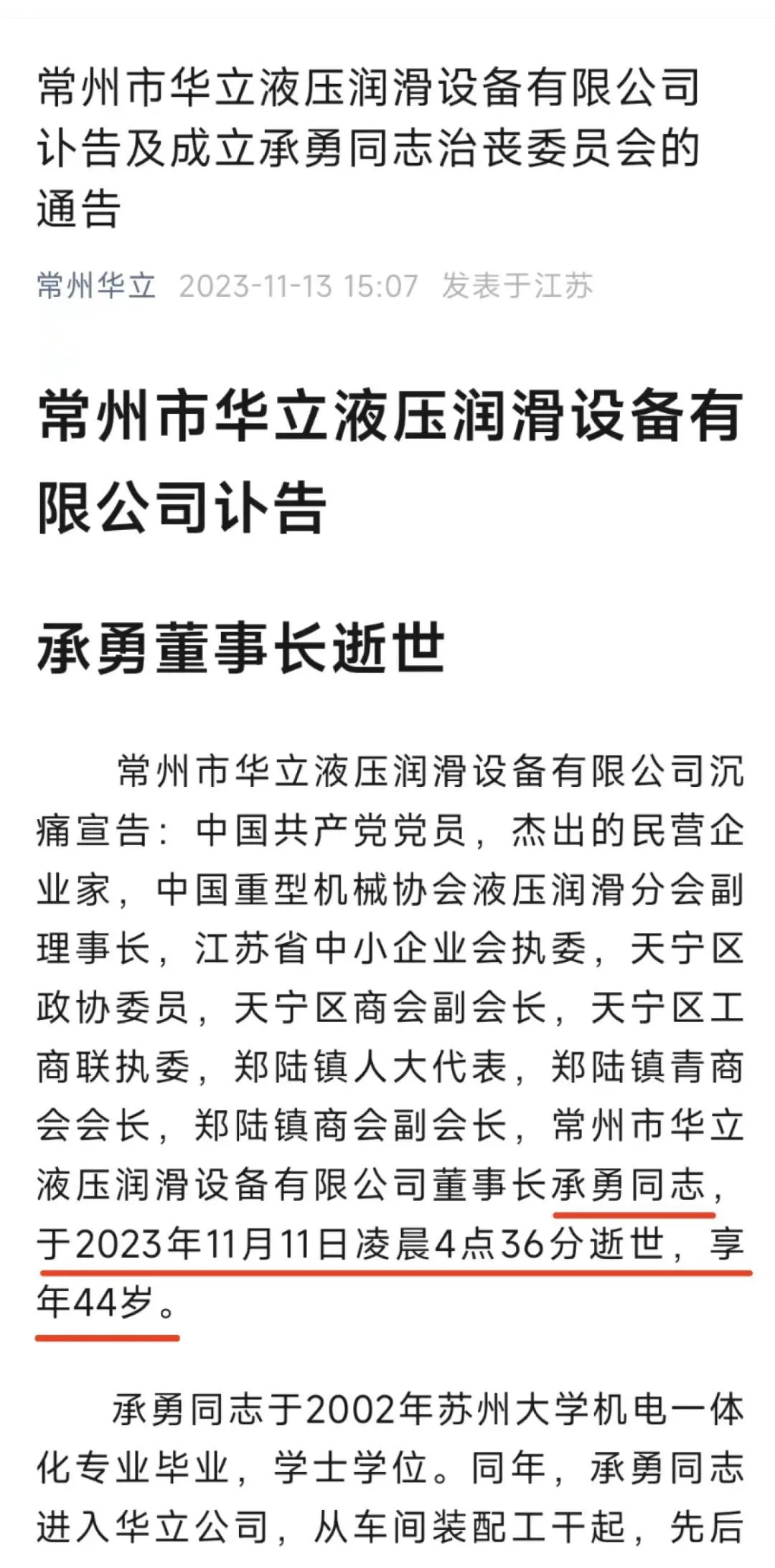 此前,11月11日,微信公众号“常州华立”发布消息称:“2023年11月11日凌晨4:36,常州市华立液压润滑设备有限公司董事长承勇遭威逼承认接受800万元存款和现金行贿,含冤跳楼身亡自证清白!”
