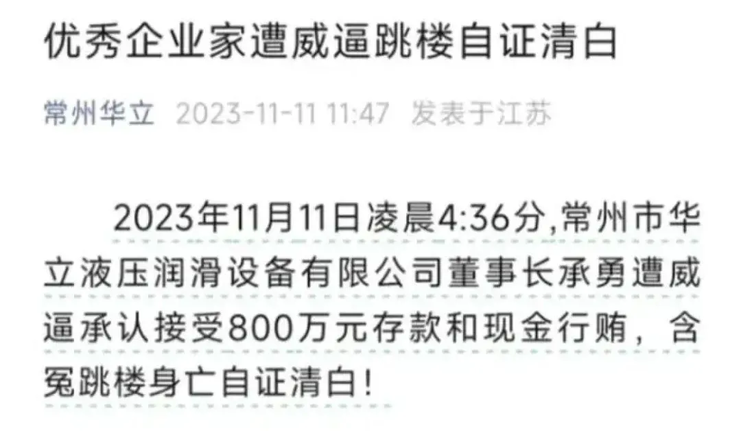 “2023年11月11日凌晨4:36分,常州市华立液压润滑设备有限公司董事长承勇遭威逼承认接受800万元存款和现金行贿,含冤跳楼身亡自证清白!”