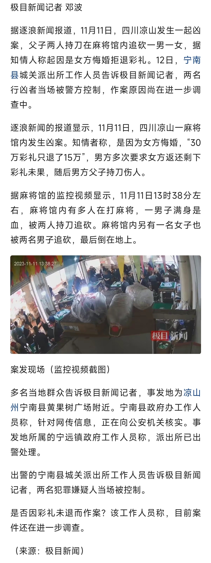 [盐都杂谈] 女方未退彩礼男方追砍2人?凉山警方:2嫌疑人当场被控制,原因待调查