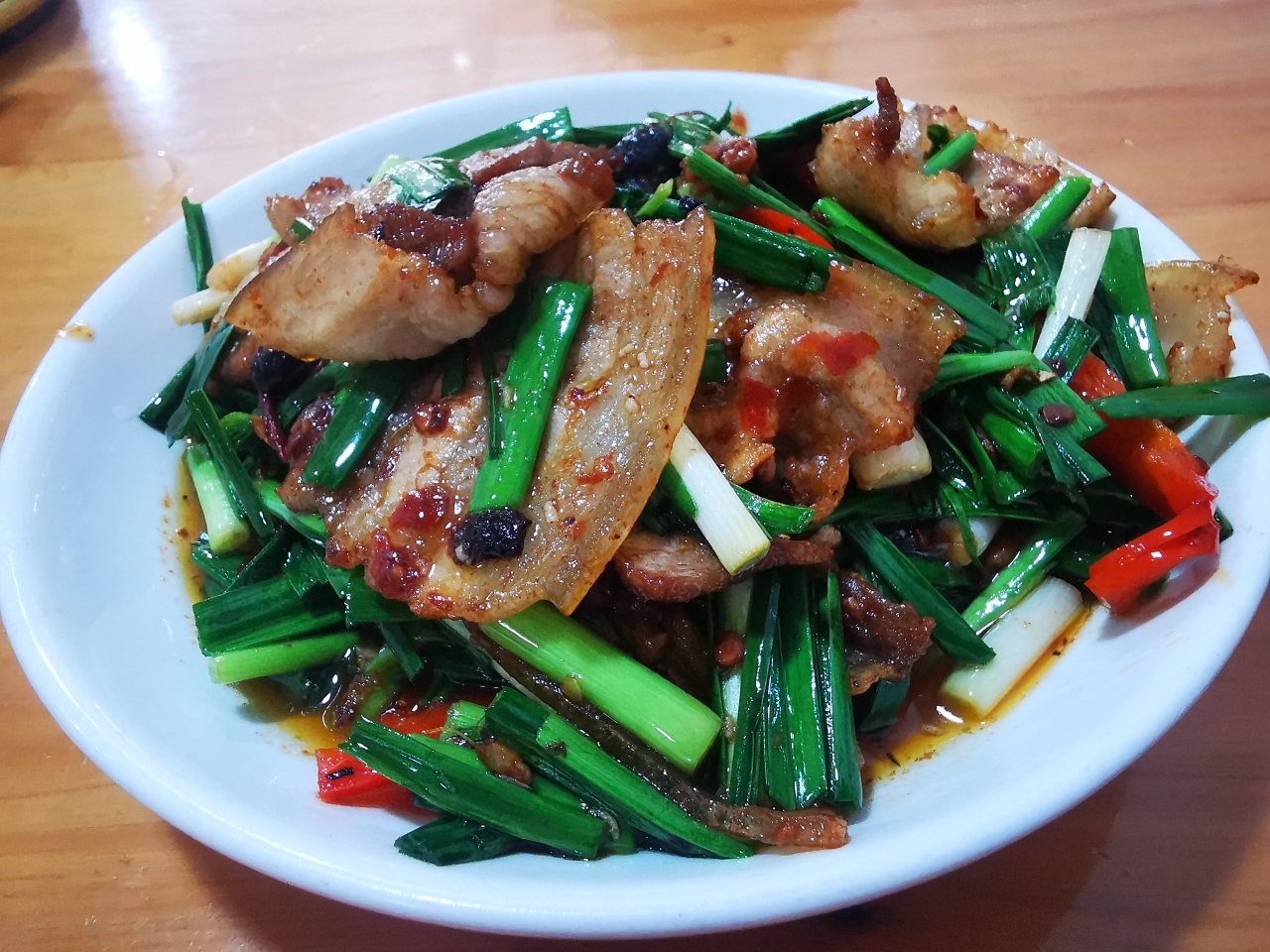 蒜苗,应该是回锅肉的标配,特点是香,其叶片和叶鞘有一股浓郁的清香味。蒜苗须炒至断生,否则吃起来会有一点辛辣。蒜苗只有在回锅肉香喷喷的油汁中翻炒、浸泡之后,才会塑造出特有的灵魂。
