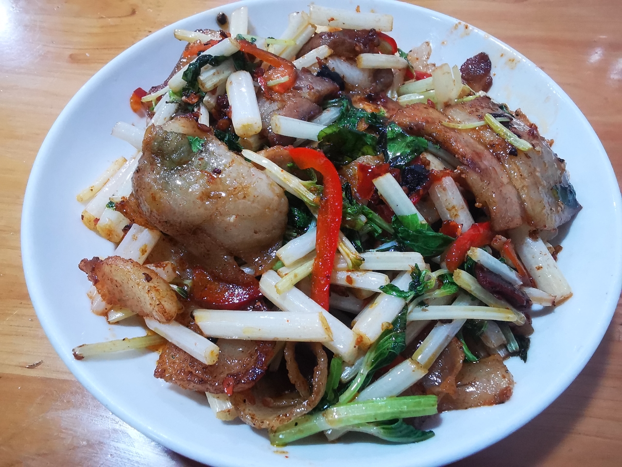 还有一种粑粑回锅肉,我认为不能将“粑粑”称之为俏头,在这里粑粑和肉一样,同为主料,在此基础上,你可另加俏头。与其说是粑粑回锅肉,不如说是回锅肉炒粑粑。吃不完的回锅肉,你还可以用来炒馒头,炒锅盔呢。
