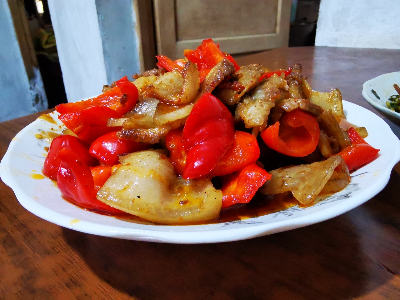 从个人喜好而言,我更钟情于青红椒嫩姜配。现在市场已少见那种颜色青红、薄皮微辣的本地大海椒,几乎都是肉嘟嘟的大红菜椒,还有那种皮质较硬的大青椒,味道已不如从前那般诱人了。