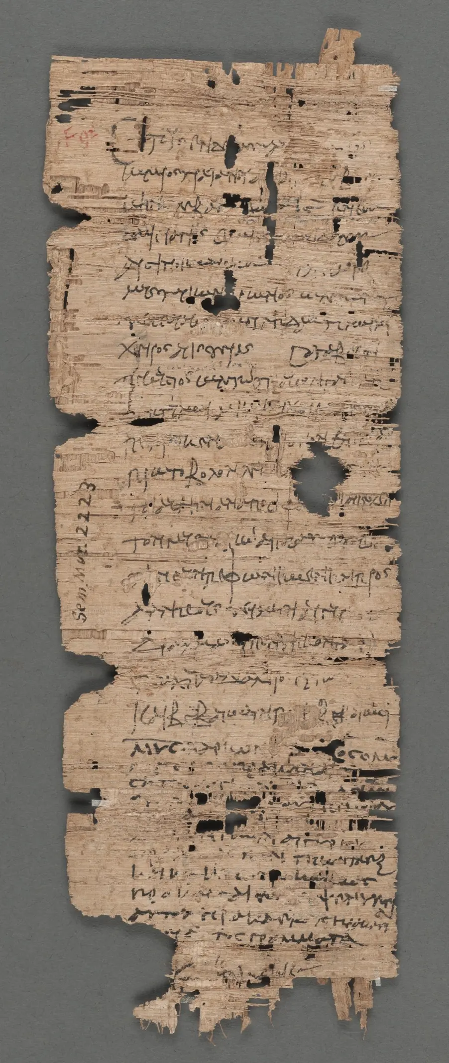 古人习惯短行纵排地分栏使用莎草纸。图为公元前126年古希腊人用莎草纸写的一张卖驴账单,原件现藏哈佛大学霍顿图书馆。