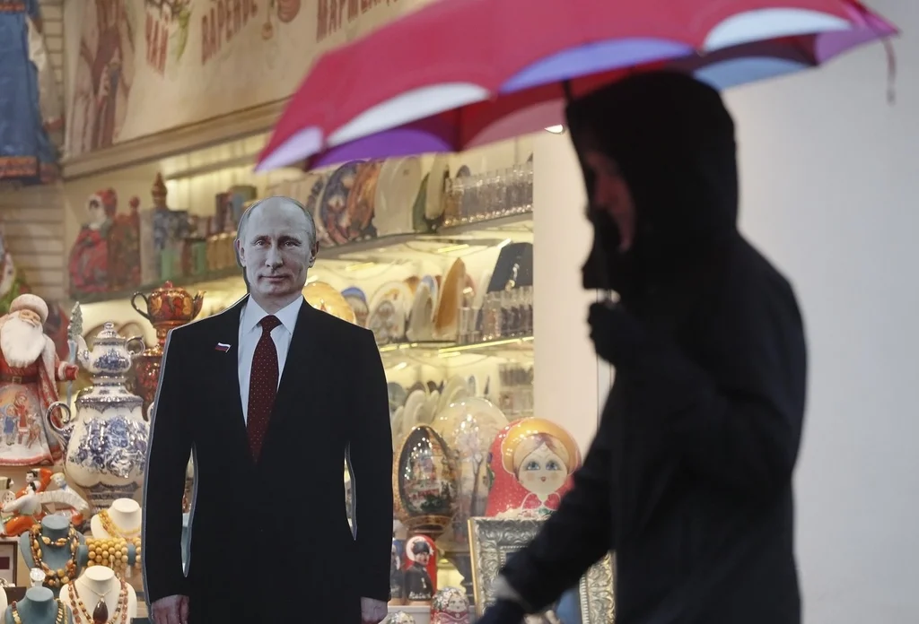 当地时间11月14日,俄罗斯莫斯科,一家礼品店外出现总统普京的人形硬纸板模型。俄罗斯将于2024年3月举行总统选举。图自IC Photo