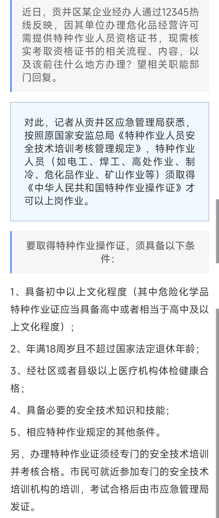 怎样办理特种作业人员资格证书?自贡官方回复来了