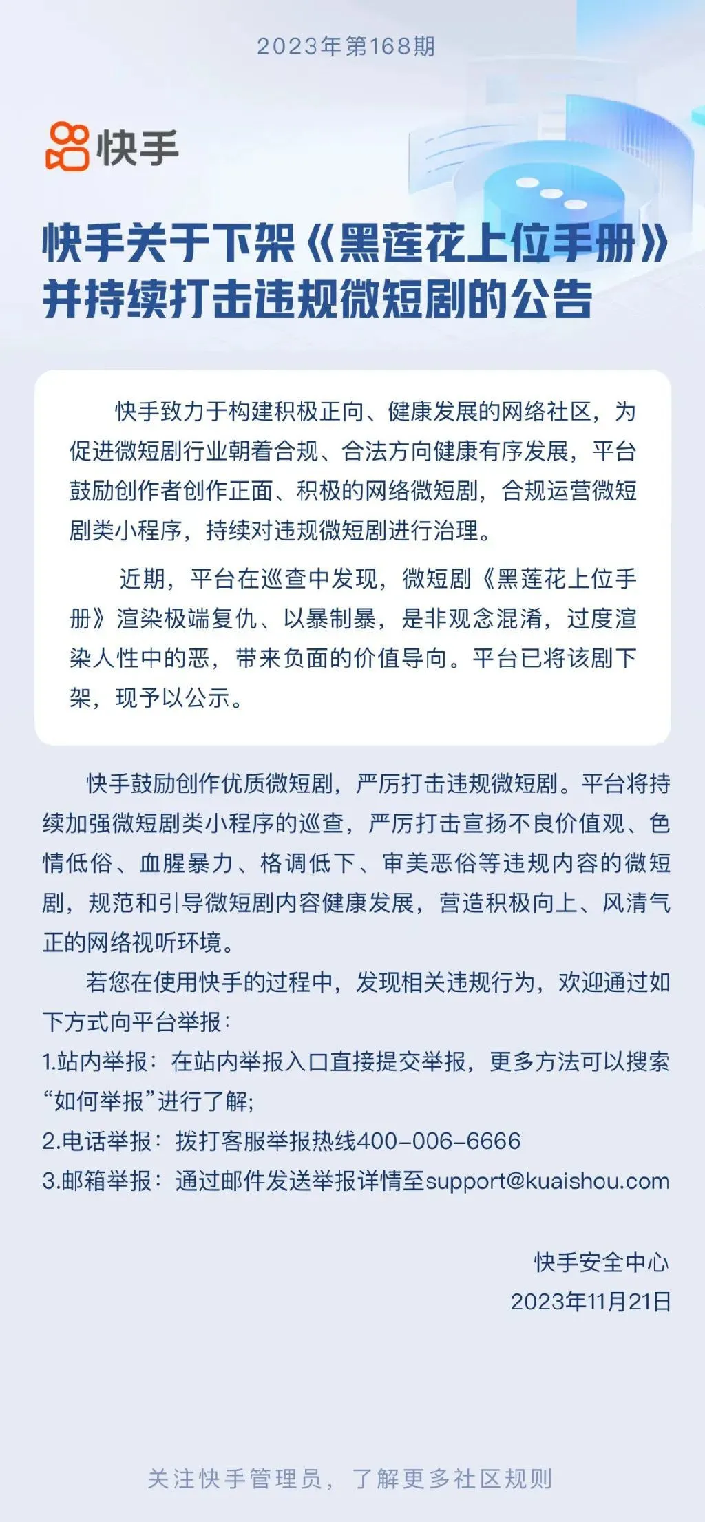 同日,快手安全中心也发布公告称,近期,平台在巡查中发现,微短剧《黑莲花上位手册》渲染极端复仇、以暴制暴,是非观念混淆,过度渲染人性中的恶,带来负面的价值导向。平台已将该剧下架,现予以公示。