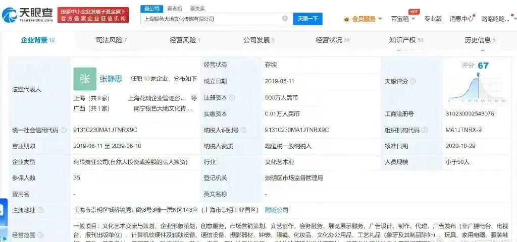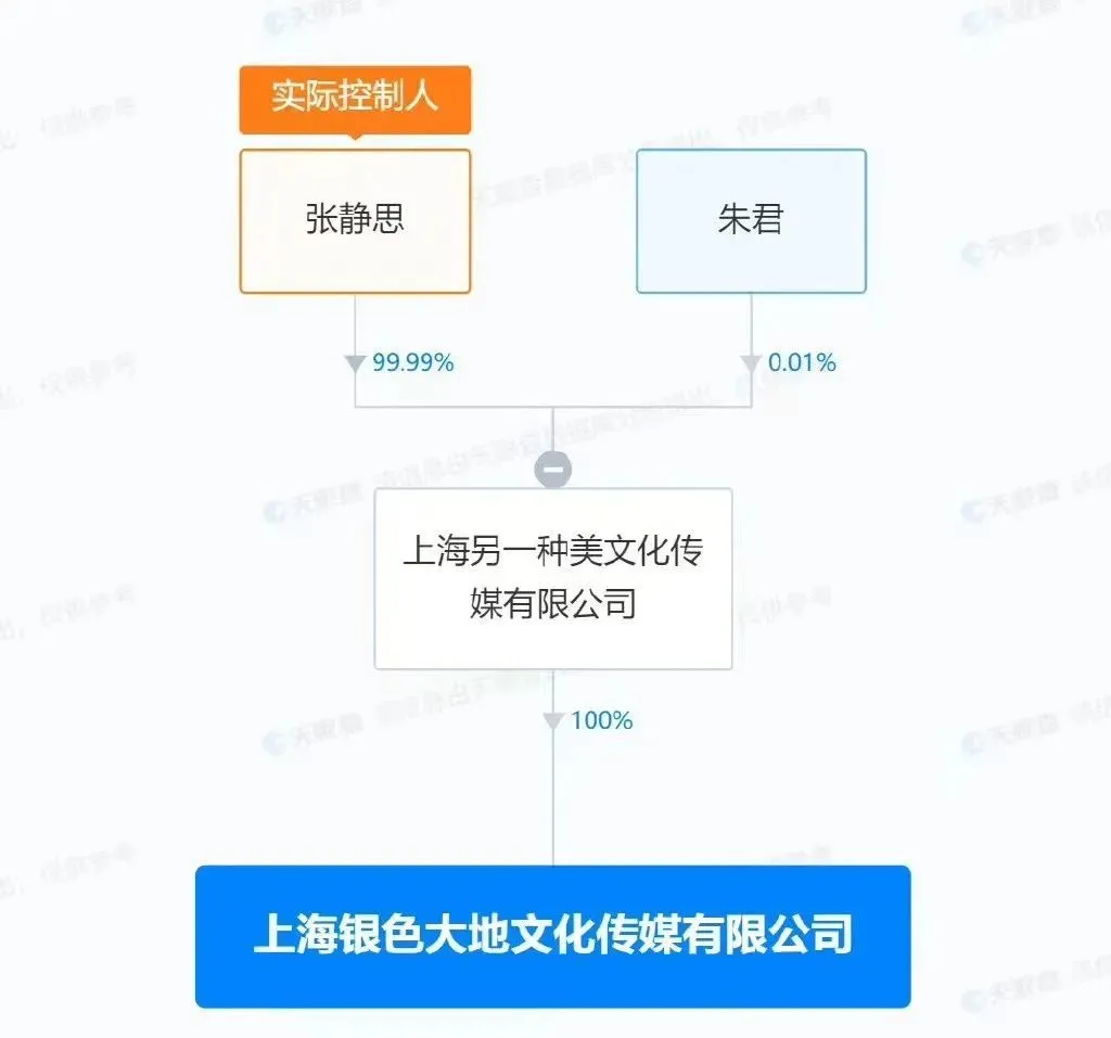 天眼查App显示,上海银色大地文化传媒有限公司成立于2019年6月,注册资本500万元,张静思为法定代表人及执行董事,并通过上海另一种美文化传媒有限公司间接持有该公司99.99%股份,为实际控制人。知识产权信息显示,该公司已申请“乔七月”“姜十七”等网红博主商标,当前商标状态多为等待实质审查。
