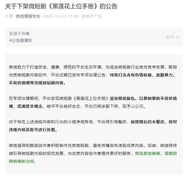 11月21日,微信珊瑚安全发布公告称:在专项治理违规微短剧期间,平台发现微短剧《黑莲花上位手册》渲染极端复仇、以暴制暴的不良价值观,混淆是非观念,破坏平台良好生态。平台已将该剧下架,现予以公示。
