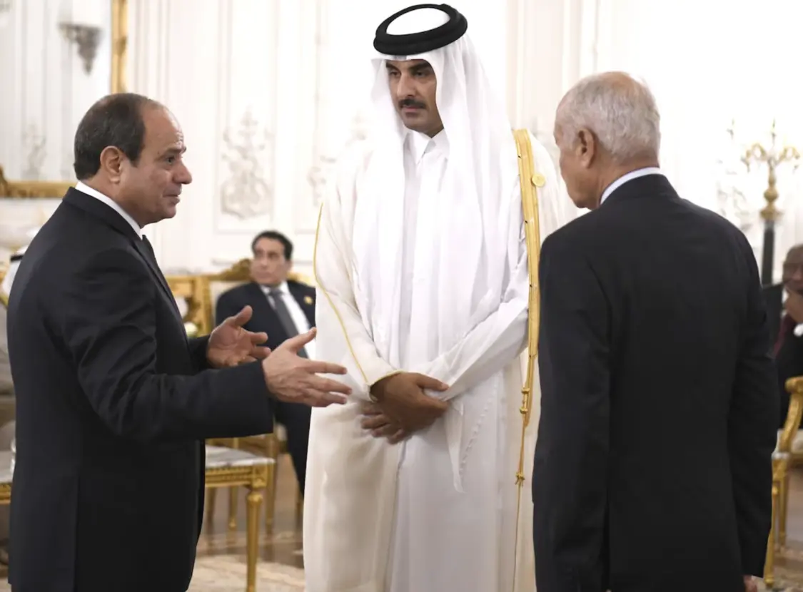 ▲埃及总统塞西(左)、卡塔尔埃米尔(国家元首)塔米姆(中)和阿拉伯联盟秘书长盖特(右)在开罗和平峰会期间讨论巴以问题