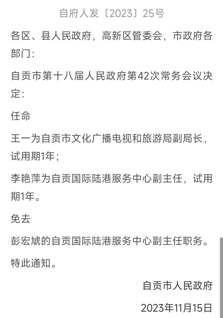 自贡市人民政府关于王一、彭宏虓等职务任免的通知