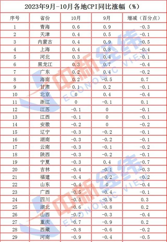 具体来看,青海、天津、内蒙古、上海、河北、黑龙江、广东、海南、甘肃等9省份同比上涨,北京、浙江持平,江苏、江西、安徽、辽宁、湖南、云南、陕西、宁夏、吉林、福建、山东、广西、四川、湖北、山西、重庆、西藏、河南、贵州、新疆等20省份同比下降,其中,贵州、河南、山西等3省份物价连续七个月回落,新疆是唯一降超1%的省份。