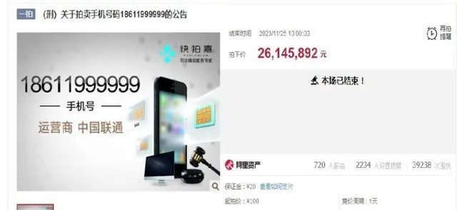 这一司法标的的竞价十分火热,近4万人围观,720人报名竞价,其中有人一次加价20万元竞拍,试图竞得这一靓号。 11月25日上午10时,本场法拍结束,自然人以最高价26145892元竞得这一手机号码,比起拍价爆增了26.14万倍。